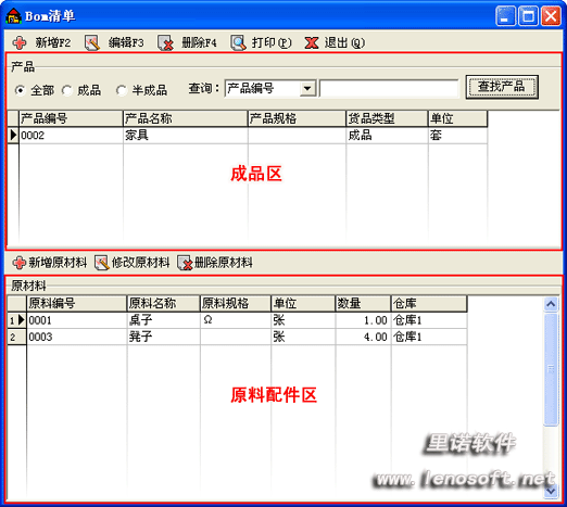 產(chǎn)品配料單是在做生產(chǎn)加工單和生產(chǎn)拆卸單之前需要完成的一個重要的工作。里諾倉庫3000管理軟件擁有最好用的產(chǎn)品BOM單添加及管理。此版面分兩個區(qū)域,上方為加工完畢后的貨品信息錄入?yún)^(qū)域,我們也考慮到了,加工好的也不一定是成品直接出庫了,也存在加工后還是半成品還需要進(jìn)一步加工的情況;下方區(qū)域則為原材料添加區(qū),依據(jù)產(chǎn)品所對應(yīng)的編號的貨品,您可在下方添加您所需要加工的原材料、配件等,還包括今后調(diào)撥的倉庫、以及所選原料的個數(shù)等。區(qū)域分明,并可根據(jù)產(chǎn)品配料單打印對照,方便今后維護(hù)管理。