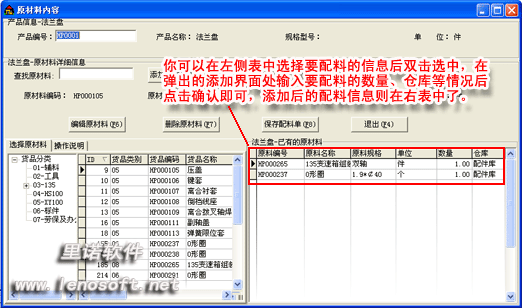 當(dāng)你操作原料配件區(qū)的新增原料區(qū)的時候,會出現(xiàn)詳細(xì)的原材料內(nèi)容添加界面。你可以在左側(cè)表中選擇要配料的信息后雙擊選中,在彈出的添加界面處輸入要配料的數(shù)量、倉庫等情況后點(diǎn)擊確認(rèn)即可,添加后的配料信息則在右表中了。