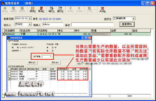 當(dāng)你選擇需要組裝的貨品時候,會彈出需要生產(chǎn)的數(shù)量,以及所需原料的數(shù)量,若實(shí)際倉庫數(shù)量不夠,則無法添加此貨品,需要重新配齊原料或者將生產(chǎn)數(shù)量減少以實(shí)現(xiàn)此次添加。