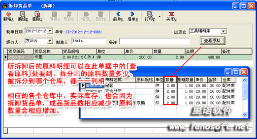 當(dāng)你選擇需要拆卸的貨品,做完拆卸貨品單后,所拆卸后的原料明細(xì)可以在此單據(jù)中的[查看原料]處看到,拆分出的原料數(shù)量多少、被拆分到哪個倉庫,都一一列明。相應(yīng)的各個倉庫中,實(shí)際庫存,也會因?yàn)椴鹦敦浧穯危善坟浧窋?shù)相應(yīng)減少,原料數(shù)量會相應(yīng)增加。