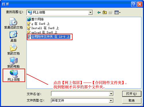 ②打開軟件,重新選擇附件路徑。點擊【網上鄰居】——【合同附件文件夾】,找到您剛才共享的那個文件夾。