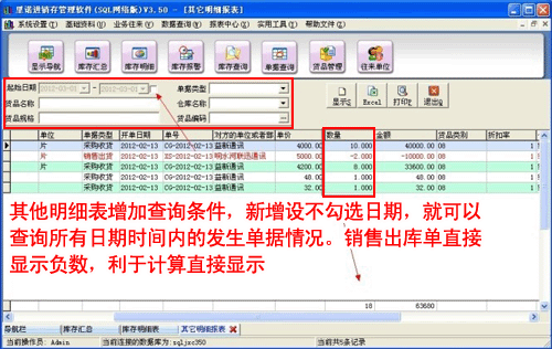 ②其他明細表增加查詢條件,新增設不勾選日期,就可以查詢所有日期時間內(nèi)的發(fā)生單據(jù)情況。銷售出庫單直接顯示負數(shù),利于計算直接顯示。