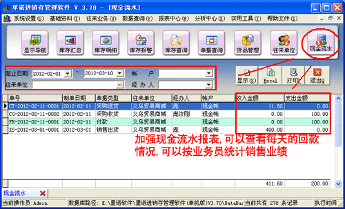 3.加強現金流水報表,可以查看每天的回款情況,可以按業務員統計銷售業績;