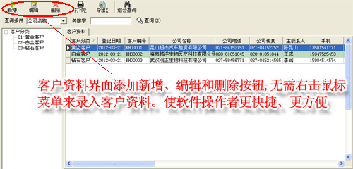 2.客戶(hù)資料界面放了新增,編輯和刪除按鈕,無(wú)需右擊鼠標(biāo)菜單來(lái)錄入客戶(hù)資料,使軟件操作者更快捷、更方便;