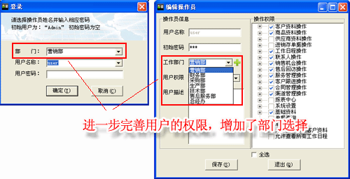 7.進(jìn)一步完善用戶(hù)的權(quán)限,增加了部門(mén)選擇;