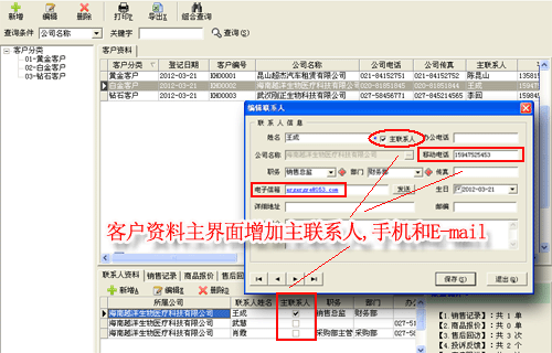 1.客戶(hù)資料主界面增加主聯(lián)系人,手機(jī)和E-mail,多聯(lián)系人方便用戶(hù)錄入,豐富了客戶(hù)聯(lián)系方式信息;