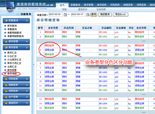 風(fēng)雷公司在購買了里諾庫存管理系統(tǒng)B/S版2年以來,根據(jù)自身需求,2012年3月份在原有軟件基礎(chǔ)上定制了業(yè)務(wù)類型分色區(qū)分功能。