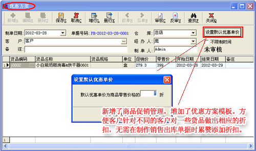 1.新增了商品促銷管理,增加了優惠方案模板。方便客戶針對不同的客戶對一些貨品做出相應的折扣,無需在制作銷售出庫單據時累贅添加折扣。