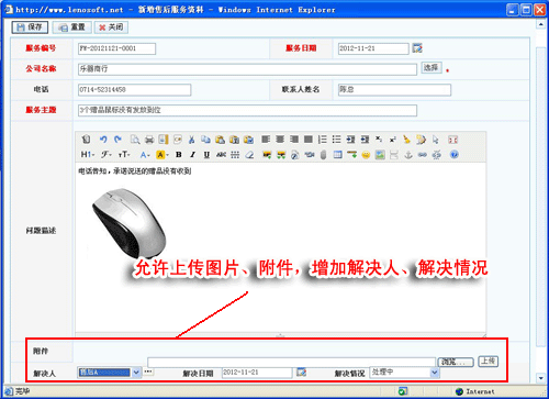 售后服務模塊還能上傳附件,如果您的客戶發了一個word文檔給您,您可以把這個word文檔做為附件記錄下來。