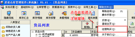 款匯出后請及時將您匯款憑證傳真給,我們收到傳真后將立即將光盤、軟件注冊密碼及發票郵寄給您。 (3)直接在軟件上注冊購買 在里諾軟件官網的“軟件下載”頁面點擊下載里諾倉庫管理軟件單機版,安裝好后打開軟件即為試用版,這時點擊主界面欄上的“幫助文件”→“注冊購買”