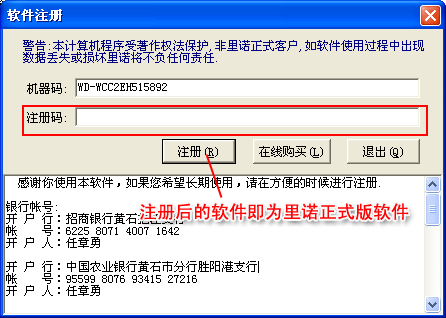 通過里諾軟件匯款賬戶付款給我們,并且通知里諾客服,在里諾客服確認款到賬后就會發送注冊碼給您進行注冊。