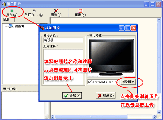 軟件支持添加圖片功能,在軟件主界面上點(diǎn)擊“圖片”按鈕進(jìn)入相關(guān)窗體,點(diǎn)擊“添加”可以將圖片直接上傳到軟件里,也可以將圖片另存在指定文件夾中,添加進(jìn)去的圖片可通過(guò)目錄進(jìn)行瀏覽,讓設(shè)備樣式一目了然。