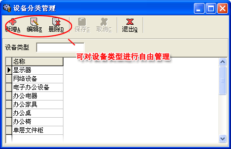軟件支持對(duì)資產(chǎn)及設(shè)備進(jìn)行分類管理,可自由“新增”、“編輯”、“刪除”設(shè)備類型名稱。