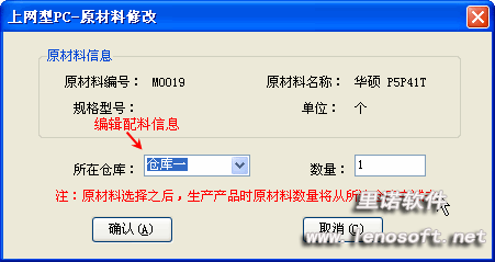 添加配料時注意配料所在倉庫,因為生產時需要從此選擇的倉庫中進行出庫;添加和修改配料完成后,點保存即可。
