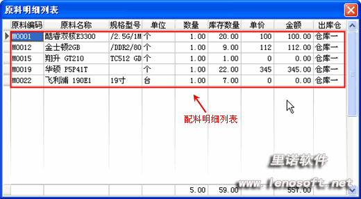 ③當生成一個成品后,成品貨品增加,配料自動減少。具體操作說明詳見軟件