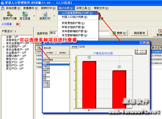 可以按照戶口類別、性別、戶籍狀態、政治面貌、婚姻狀況、文化程度、血型、健康狀況、民族、宗教信仰、兵役情況、遷入類別、遷出類別項目查看,亦可選擇餅狀或者柱狀圖進行查看。