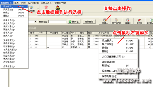 軟件提供多種方式對用戶進行操作,例如在添加新用戶時,您可以選擇“數據操作”→“添加新戶”、直接點擊主界面的“新增”按鈕和點擊鼠標右鍵進行添加。