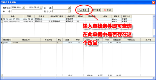 查找貨品:在錄制單據時,當一個單據中貨品過多時,可以利用此工具來進行查詢單據中是否已經錄入此貨品。方便用戶進行查找和核對。