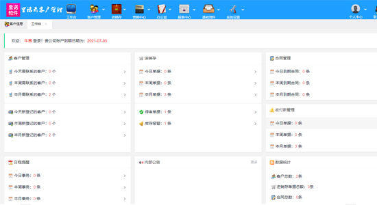 9.工作臺板塊可以一目了然的查看到今天需要聯系的客戶,已過期未聯系的客戶,今天生日的客戶及未處理的服務,今日、明日、本周的日程安排等
