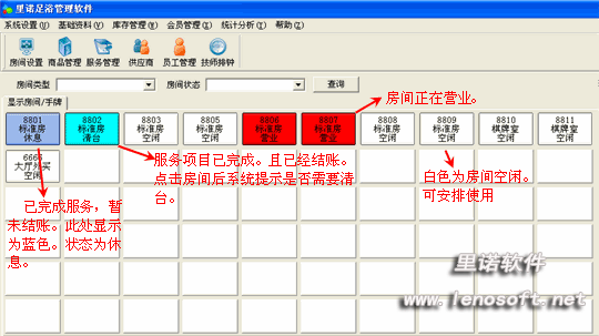 空閑:指房間沒有技師在里面做服務,也沒有客人在房間,空閑狀態的房間顏色為白色,房態圖上顯示為“空閑”兩個字。