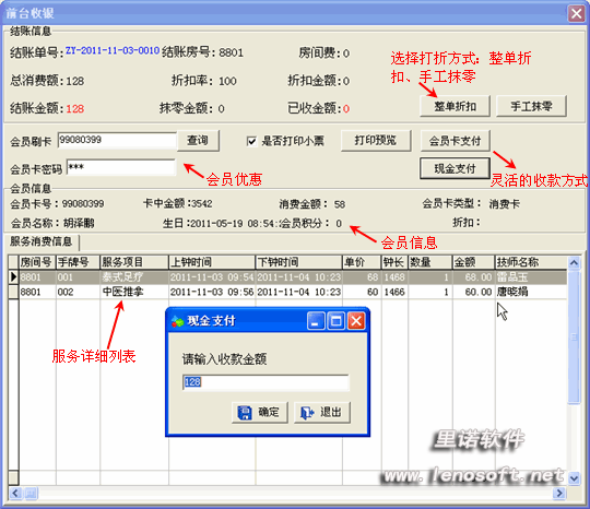 9.操作員可對消費但未結帳的單據進行修改、刪除 ;服務項目可修改、定價,允許特殊打折。
