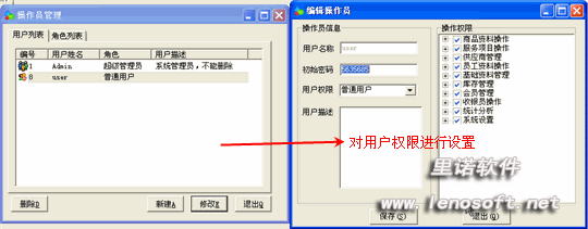 操作員管理主要是指系統的"超級管理員"通過用戶設置和權限分配來改變普通用戶的權限設置窗口,它有利于重要數據的保密。窗口左邊的現有操作用戶的名單,選中該用戶名,則右邊的權限列表中劃勾的項目即為該用戶擁有的權限。