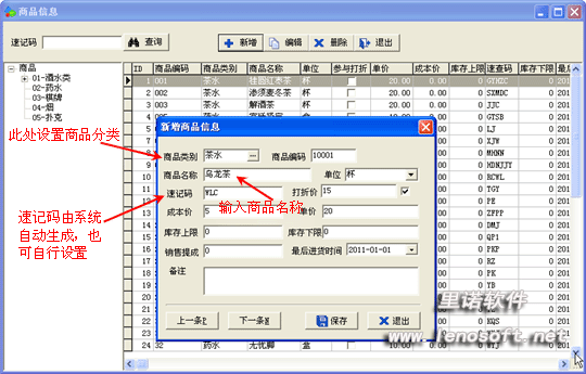 點擊“增加商品”,打開如圖所示子窗口,先選擇商品所屬類別系統會自動生成商品編號和助記碼,輸入商品名稱、單位。