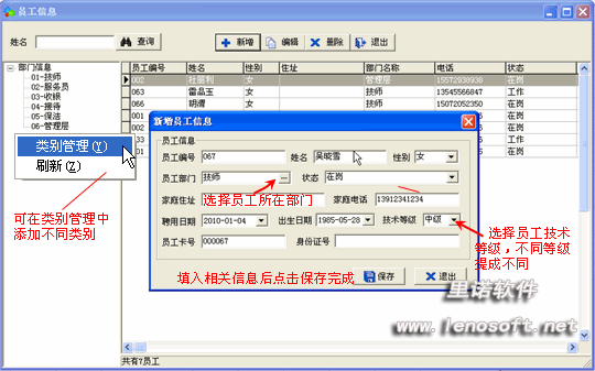在此窗口中可設置員工的部門及員工的資料,即人事檔案的相關內容。首先增加部門,添加的方式與添加商品的方式一樣,部門添加完成后,再增加員工資料,點擊“新增”,打開新增員工信息子窗口,在對應的欄目中輸入或選擇好員工編號、員工部門、技術等級、姓名、年齡、性別、證件號、聯系電話、住址相關資料,完成后點擊“保存”按鈕即可。其他的修改部門、編輯員工、刪除部門、刪除員工的操作與商品設置中的一樣,可以參照前面的操作步驟。