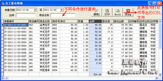 可以查詢出某段時間內所有技師的服務情況。此表格包括的項目非常明細,可以統計出單據號、房號、手牌號、技師工號、服務項目、數量、金額、提成、與此服務項目相關內容都可以非常明細的統計出來。 |